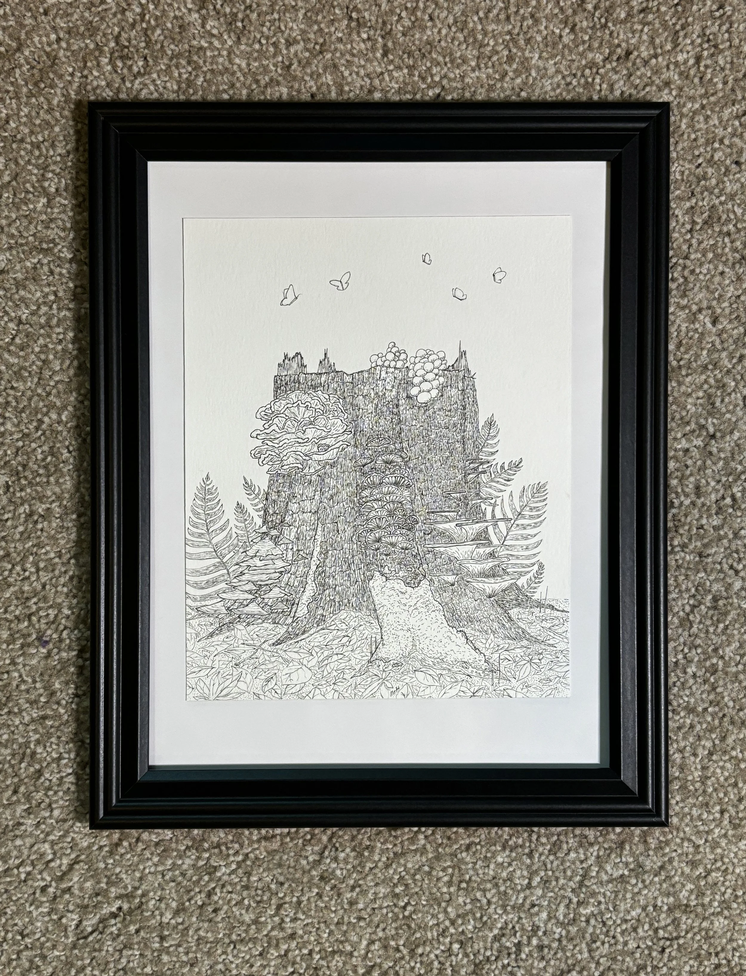 “Floral Bouquet” includes 6 different types of fungi growing on a decaying stump, in their natural habitat: Chicken of the Woods, Pea-Shaped Puffball, Splitgill, Turkey Tails, Dryad’s Saddle, and your typical lichens. This is by far the most detailed and time-consuming tree drawing that I have undertaken thus far and I loved every second of creating it.